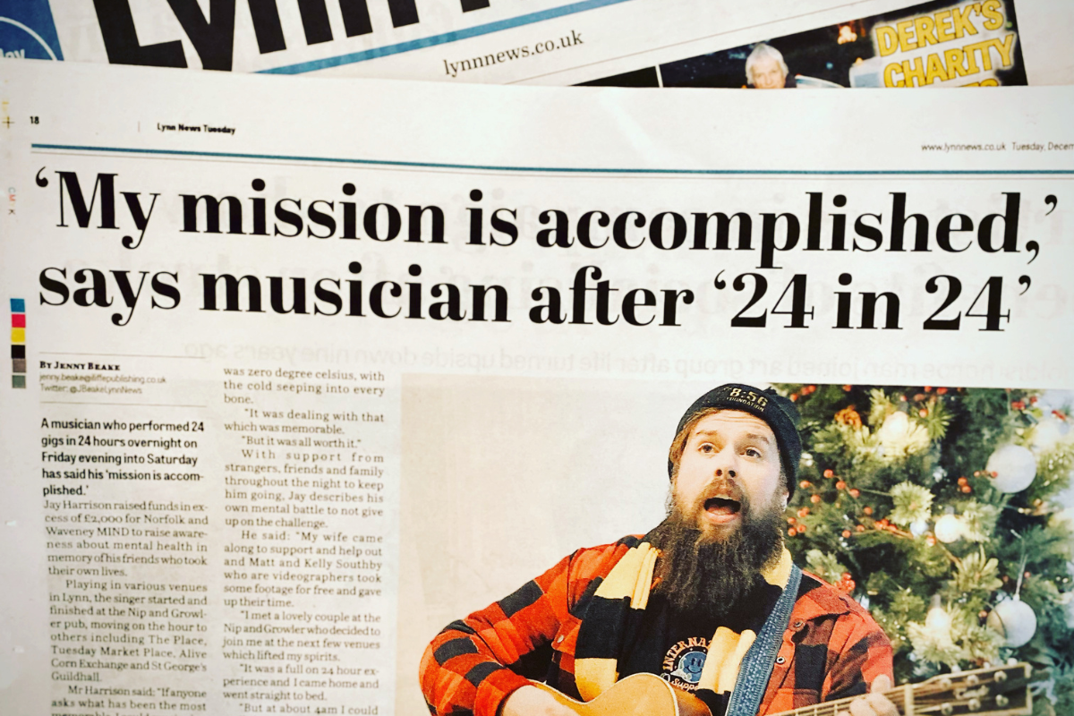 That might seem like a weird thing to say but it’s true. I was quite happy living in ignorance of the mental health problems that can indiscriminately take control of anyone’s life at any time. My journey to this challenge was through loss and facing 24 gigs in 24 locations in 24 hours, was my way of handling and channelling my grief, my guilt, my sadness into something positive in memory of our loved ones who have lost their battle. Those losses, for me, were a wake up call that have led to education, empathy and the chance to create awareness and prevention opportunities, first through 24in24 and now in my role within the Complex Bereavement Service of Norfolk and Waveney Mind.