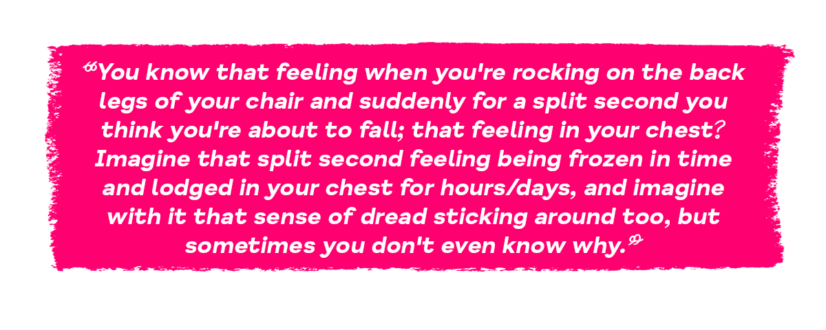 Anxiety is a natural human response when we feel that we are under threat. It can be experienced through our thoughts, feelings and physical sensations.
