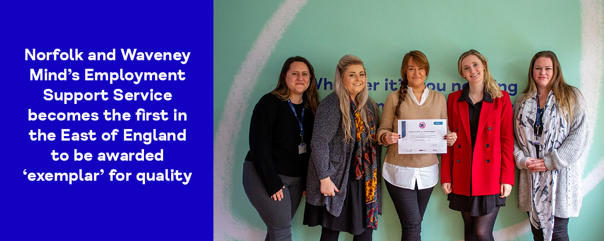 Following an external review, Norfolk and Waveney Mind’s Individual Placement and Support (IPS) service team have become the first IPS Service in the East of England to achieve exemplary status for providing routes to employment for people with severe mental health conditions.
